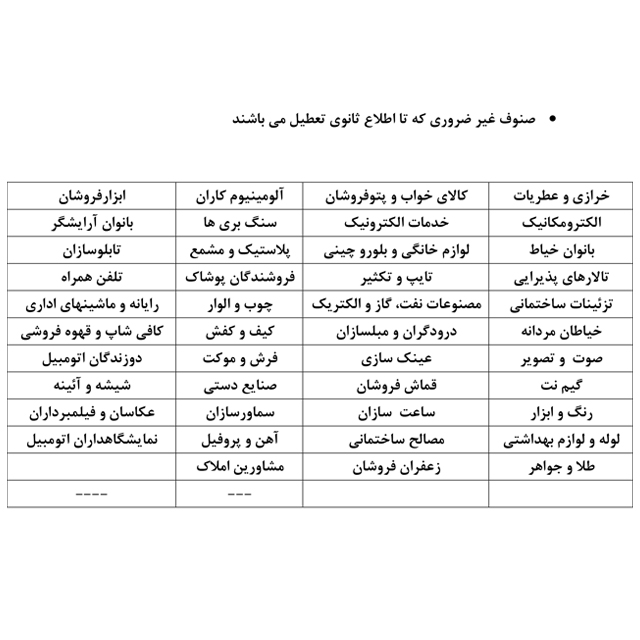 ساعت کاری واحدهای صنفی ضروری و غیر ضروری تا ۲۰ فروردین ماه اعلام شد.