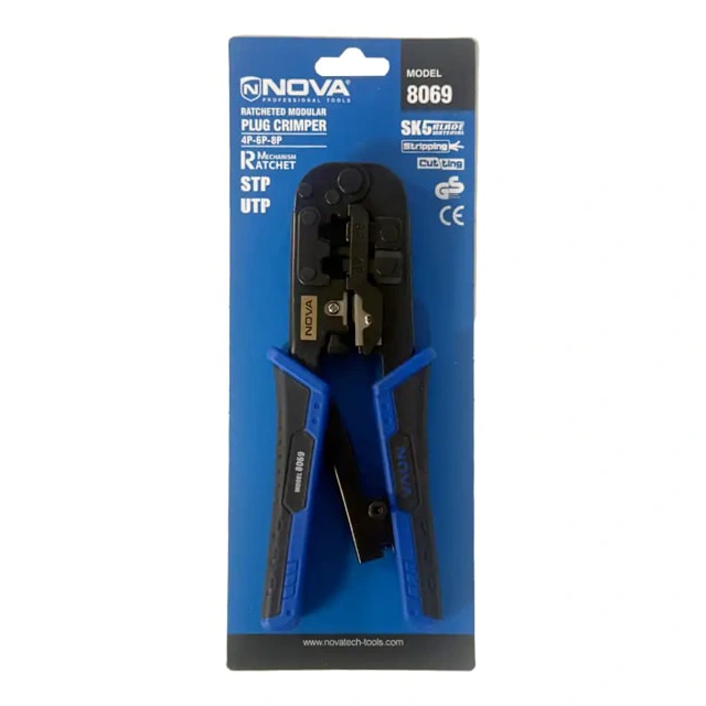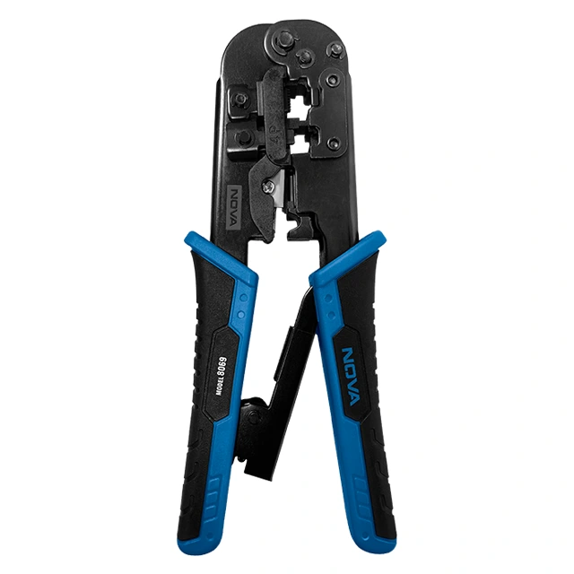 انبر سوکت زن تلفن و شبکه دسته جغجغهای نووا مدل 8069، ابزاری چندمنظوره و حرفهای برای پرس، برش و لختکردن کابلهای تخت و گرد است. این ابزار برای سوکتهای شبکه RJ45 (8P8C) و سوکتهای تلفن RJ11/RJ12 (6P4C/6P6C) طراحی شده و به لطف فکهای دقیق خود، پرس کاملاً یکنواخت و استانداردی را فراهم میکند. بدنه ساختهشده از فولاد حرارتدیده A3 دوام بالا و عملکرد مطمئن ابزار را تضمین مینماید.