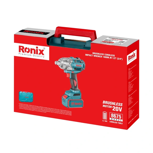 بکس شارژی براش‌لس 20 ولت 1.2 اینچ (3.4 اینچ) رونیکس با سری قابل تعویض مدل 8675، در یک کیف BMC مقاوم به همراه 2 عدد باتری، شارژر و سایر متعلقات به بازار ابزار ایران عرضه می‌شود.