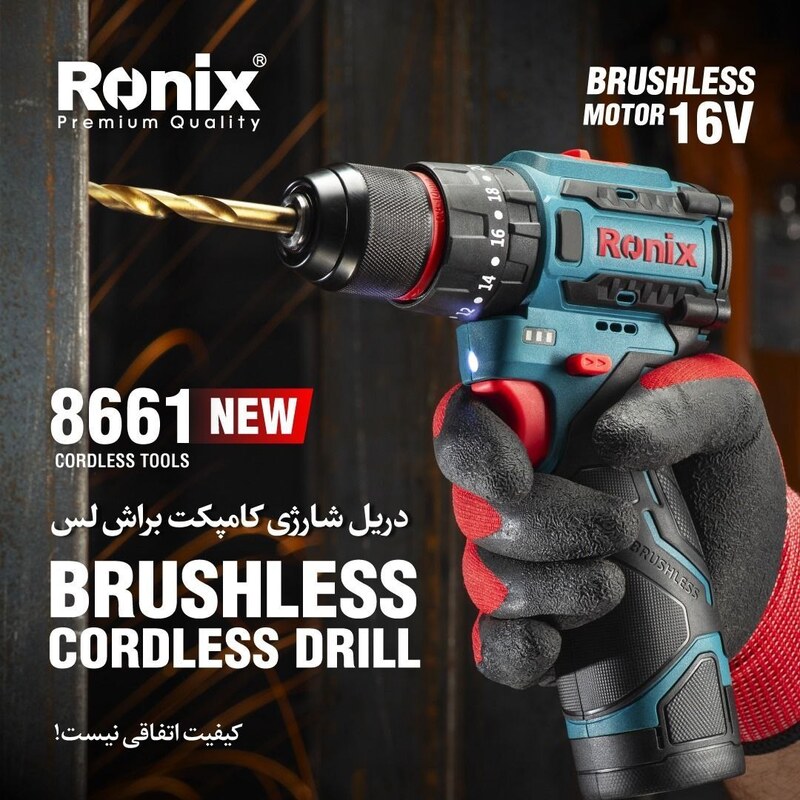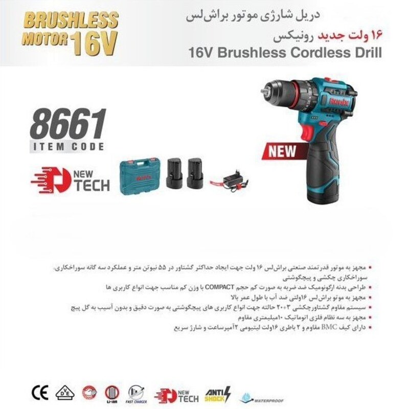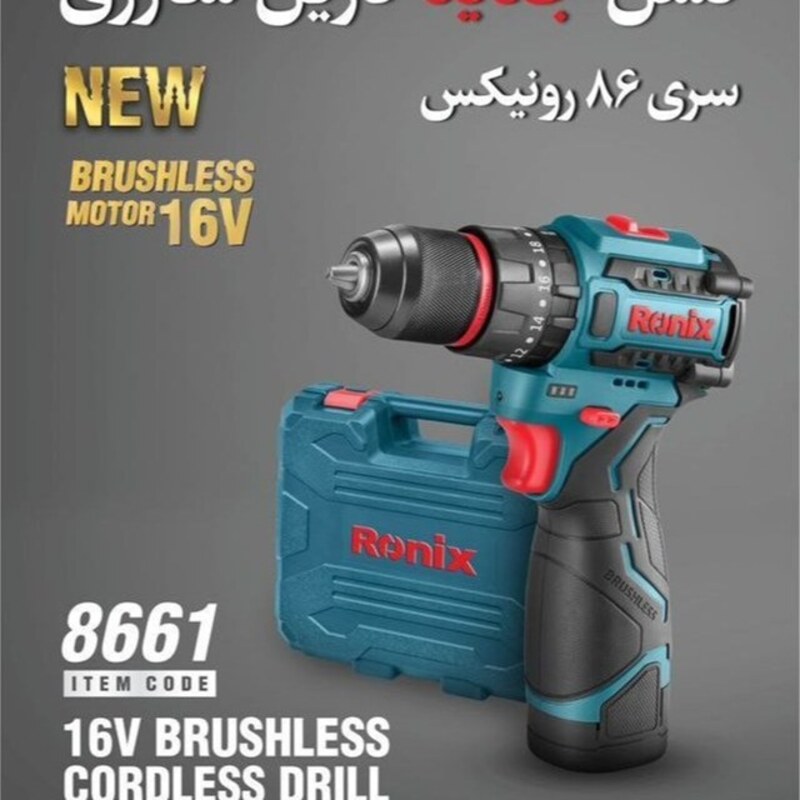 ویژگی‌های دریل چکشی شارژی براشلس 16 ولت رونیکس مدل 8661: