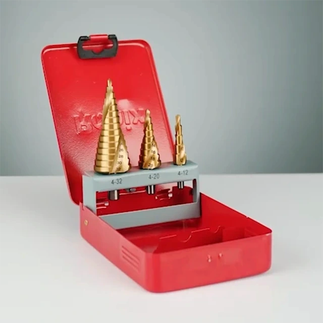 • ست ۳ عددی از سایزهای متنوع مته مخروطی با طراحی پله ای هر کدام جهت انجام سوراخکاری با قطرهای مختلف، تنها با یک مته
