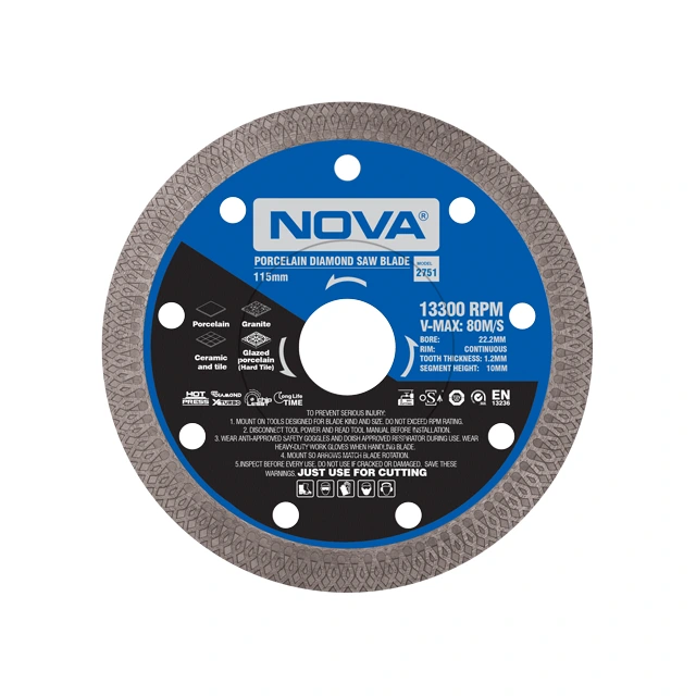 صفحه برش الماسه پرسلان بر توربو 115 میلیمتری نووا مدل 2751، ابزاری تخصصی برای برش دقیق و سریع پرسلان، گرانیت، سرامیک و کاشی‌های سخت است. طراحی این صفحه به گونه‌ای است که امکان برش خشک و مستقیم را بدون لب‌پریدگی فراهم می‌کند و با بهره‌گیری از سگمنت‌های توربو مشبک، قدرت برشکاری آن در شرایط پر فشار افزایش یافته است. وجود ذرات الماس با تراکم بالا در لبه این صفحه، استحکام فوق‌العاده و طول عمر بالا را برای آن تضمین می‌کند.