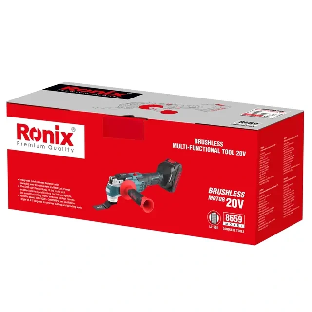 رونیکس با تولید فرز همهکاره شارژی 8659، با کیفیت متمایز و کاربردهای متنوع، نیازهای شما را به بهترین شکل پوشش داده است. میتوانید با توجه به نوع کاربرد مورد نظر خود، یکی از انواع تیغهها یا متعلقات این فرز همهکاره را انتخاب کنید.