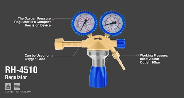مدلهای باکیفیت و متنوع مانومتر اکسیژن رونیکس با نهایت دقت و کارایی طراحی و تولید میشوند تا پاسخگوی نیازهای کاربران باشند. برای مثال، میتوانید از مانومتر اکسیژن رونیکس مدل RH-4510 برای کنترل و تنظیم فشار گاز اکسیژن استفاده کنید. این مانومتر دو گیج برای نمایش دقیق فشار دارد. طراحی برنجی بدنه، علاوه بر استحکام، نصب آسان این ابزار را آسانتر میکند. فیلتر فلزی این مانومتر رونیکس از ورود اجسام خارجی به داخل سیستم جلوگیری کرده و باعث به افزایش عمر مفید دستگاه میشود. در بخش شرح جزئیات محصول، با مشخصات مانومتر اکسیژن رونیکس مدل RH-4510 بیشتر آشنا شوید.