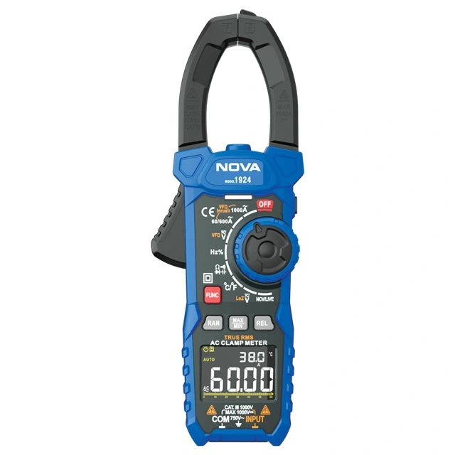 مولتی متر کلمپی AC دیجیتال 1000 ولت نووا مدل 1924 ابزاری دقیق و چندمنظوره برای اندازه‌گیری جریان AC تا 1000 آمپر، ولتاژ AC، مقاومت، فرکانس، دیود، خازن و دما است. این دستگاه با فک بازشونده تا قطر 35 میلیمتر، قابلیت تست جریان در کابل‌ها و سیم‌های ضخیم را فراهم می‌آورد. همچنین، مجهز به تستر ولتاژ غیرتماسی (NCV) و فازمتر تماسی بوده و سیستم محافظت در برابر اضافه بار، امنیت بالای کاربر را تضمین می‌کند. ورودی با امپدانس پایین از بروز خطای ناشی از ولتاژهای القایی جلوگیری کرده و فیلتر پایین‌گذر (LPF) دقت اندازه‌گیری سیگنال‌های موتور و ترانسفورماتور را افزایش می‌دهد.