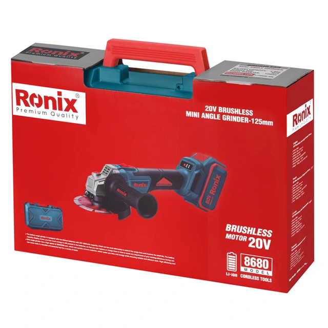 مینی فرز شارژی براشلس 20 ولت 125 میلیمتری رونیکس مدل 8680، در کیف مقاوم BMC همراه با 2 عدد پک باتری، 1 عدد شارژر، 1 عدد محافظ، 1 عدد آچار،1 عدد دسته کمکی به بازار ابزار ایران عرضه میشود.