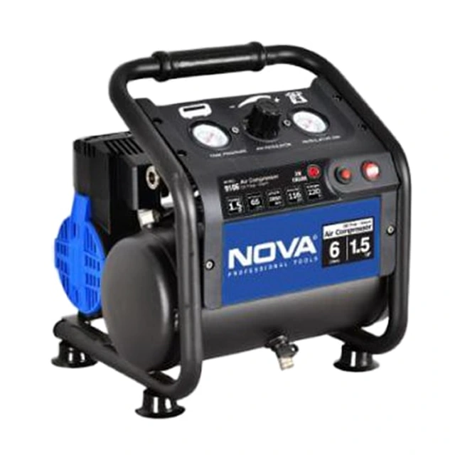 کمپرسور باد سایلنت 6 لیتری نووا مدل 9106 یکی از گزینه‌های کاربردی و کم‌ صدا در میان کمپرسورهای خانگی و کارگاهی به شمار می‌آید. طراحی بدون روغن (Oil-Free) در این محصول، علاوه بر کاهش نیاز به سرویس و نگهداری، موجب افزایش طول عمر دستگاه و تمیزی هوای خروجی شده است. این کمپرسور با موتور قدرتمند %100 مسی، توانایی تأمین هوای فشرده برای طیف وسیعی از ابزارهای بادی سبک مانند میخکوب، منگنه‌ کوب، دستگاه‌ها و تجهیزات بادی درمانگاه‌ها و بیمارستان‌ها و کارهای عمومی کارگاهی را دارد.
