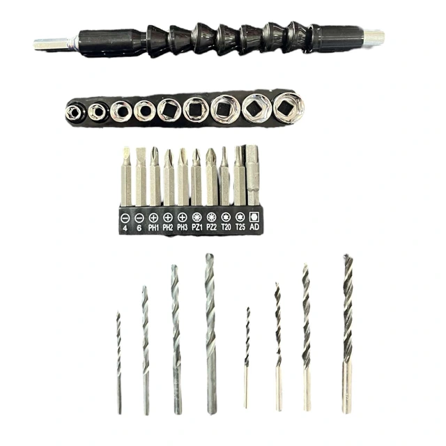 متعلقات: ۲ عدد پیچ گوشتی (- +)، یک عدد انبردست، ست نوک پیچ گوشتی، یک عدد کاتر، یک عدد آچار فرانسه، ست بکس ۸ عدد، مته دریل، فازمتر، ۱ عدد چکش، متر ۳ متری