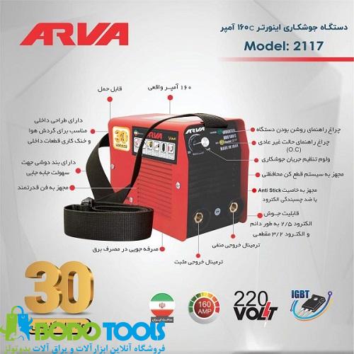 اینورتر جوشکاری Arc 160c شرکت آروا  ابزار بسیار کارآمد و مقرون به صرفه می باشد . از تولیدات داخلی شرکت آروا به حساب می‌آید و دارای سیستم قطع کن محافظتی است.  در برابر نوسانات از دستگاه محافظت می کند. این دستگاه جوشکاری دارای بند دوشی به جهت سهولت در جا به جایی است و با توجه به آنکه وزن سبکی دارد. دارای حجم کوچکی نیز می باشد. اینورتر جوشکاری Arc 160c مدل 2117 مجهز به تکنولوژی IGBT است .